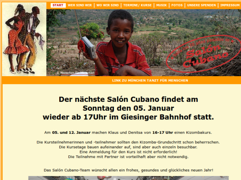 Der gemeinnützige Verein SALÓN CUBANO e.V. ist ein Zusammenschluß Münchner Tänzerinnen und Tänzer. Ihre Absicht ist die finanzielle Förderung der Äthiopienhilfe STIFTUNG MENSCHEN FÜR MENSCHEN durch Erlöse aus regelmäßig durchgeführten öffentlichen Tanzveranstaltungen. Sämtliche Mitglieder, Helferinnen und Helfer arbeiten dafür unentgeltlich.